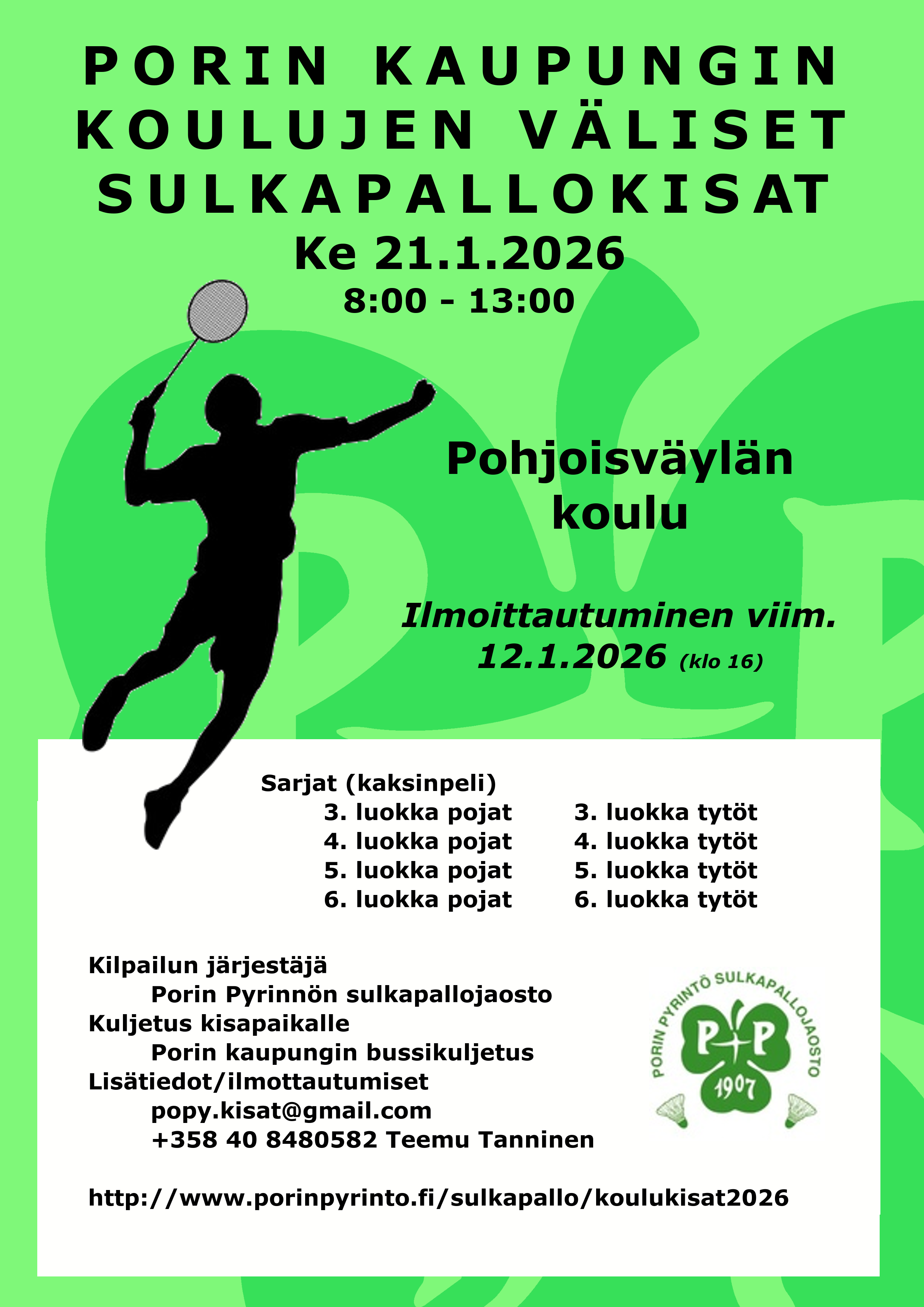 Porin Pyrinnön sulkapallojaosto järjestää Porin kaupungin koulujenväliset sulkapallokilpailut alakoulun 3. - 6. luokan oppilaille.