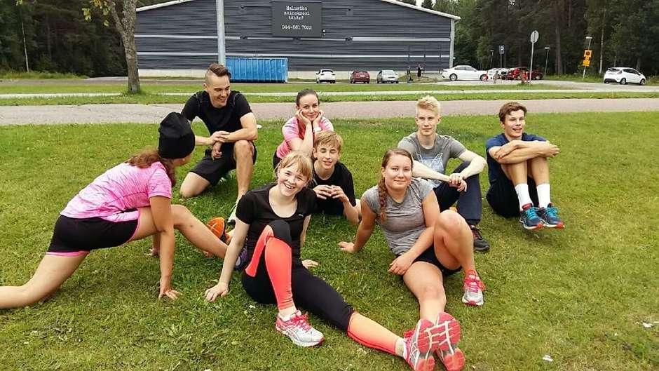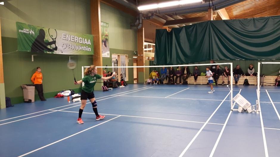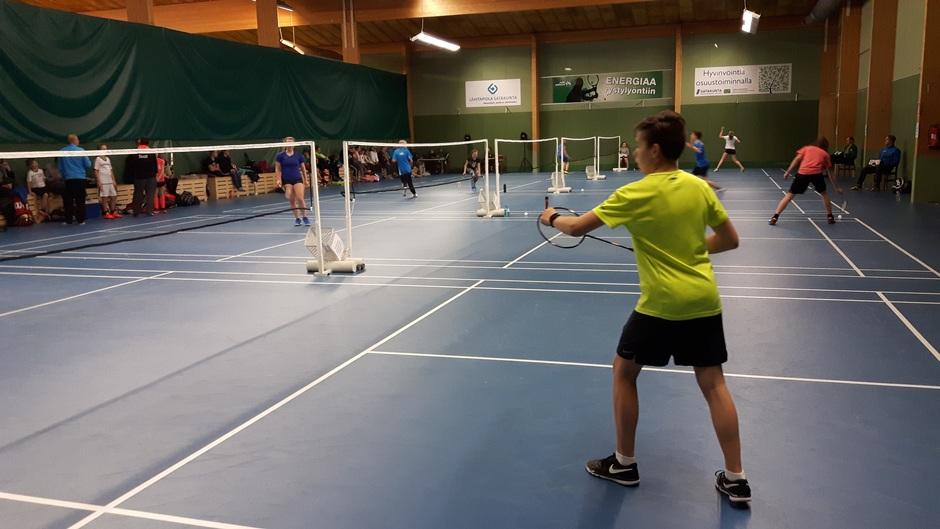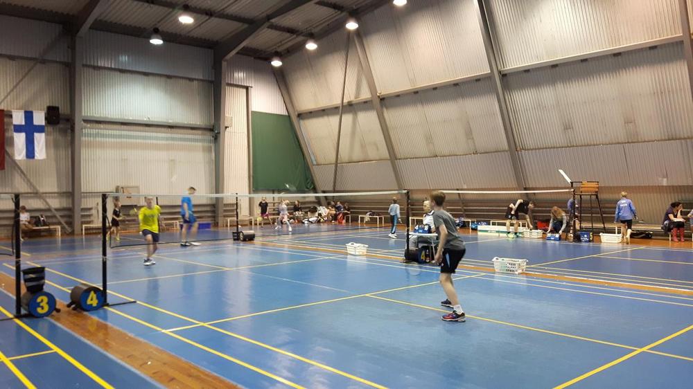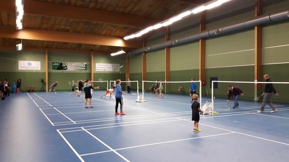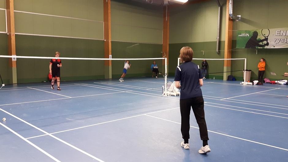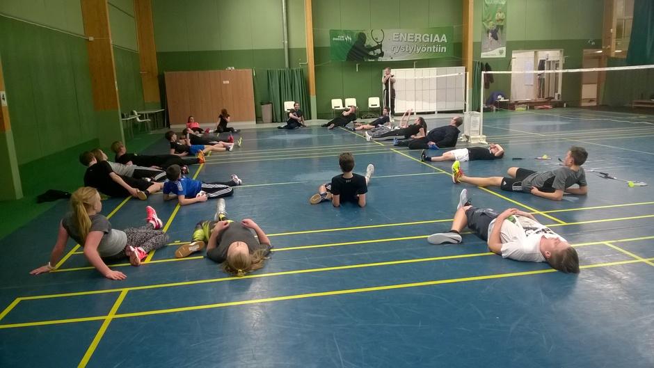 Sulkapallokoulun venyttelytuokio Topin ja Jarin vetämänä