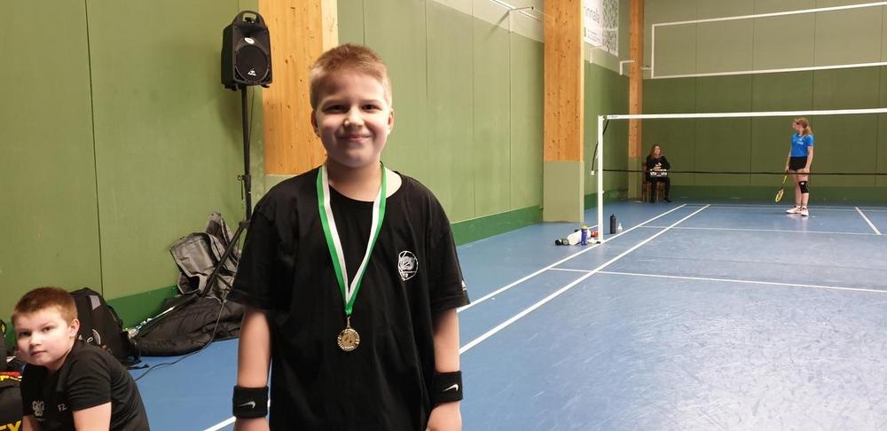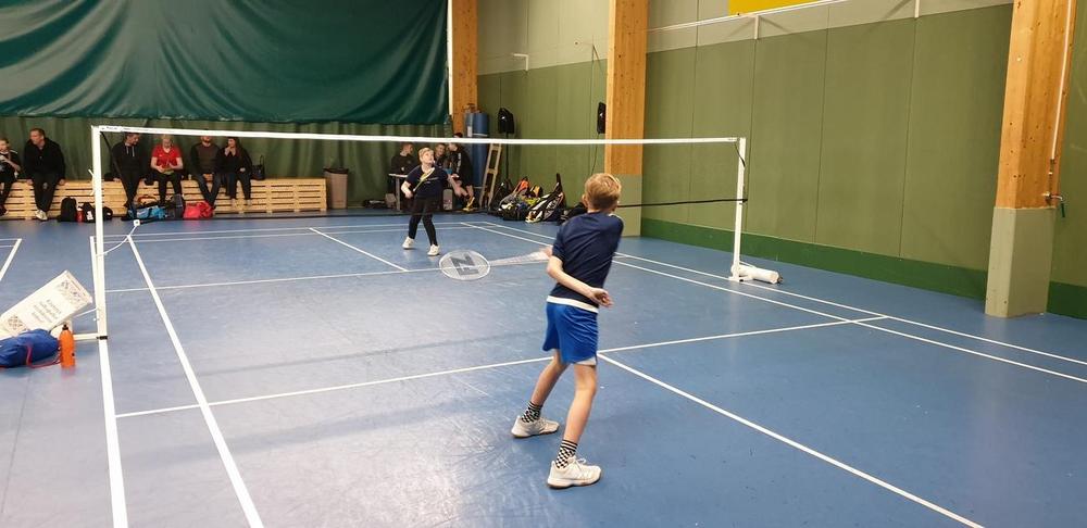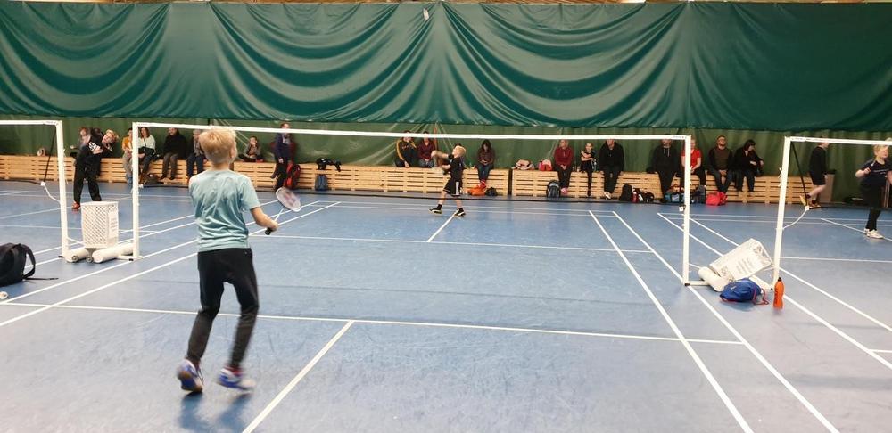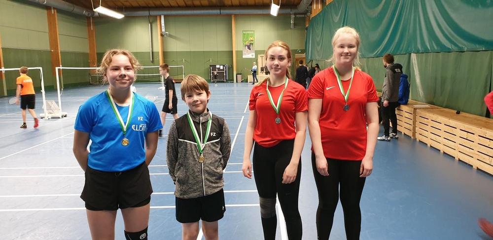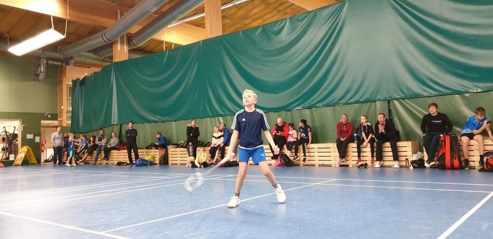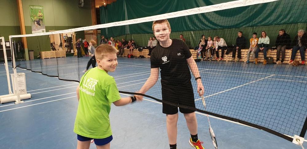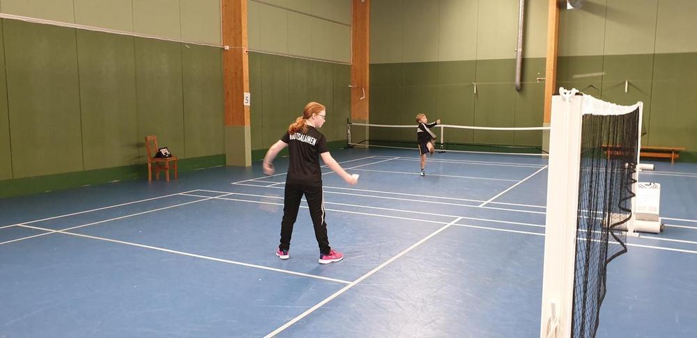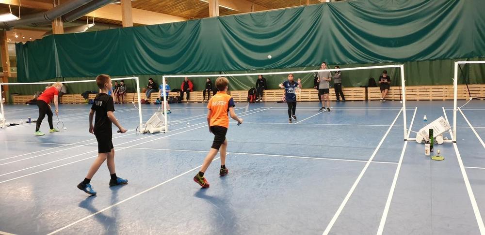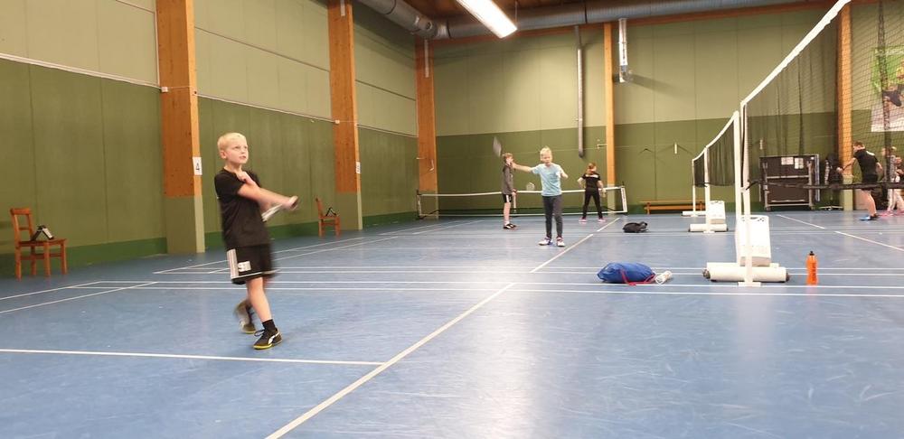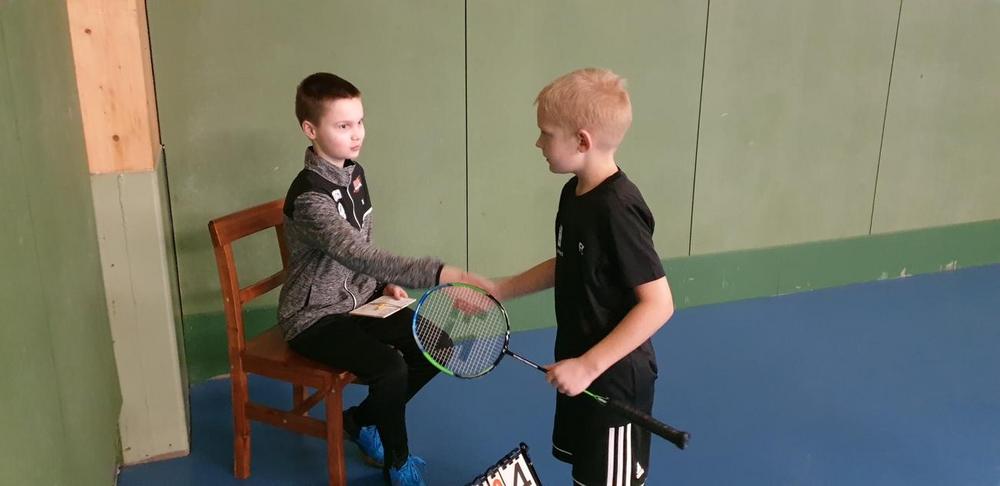 Suomenmestari Valtteri Nieminen kuvassa sulkapallokoululaisten kanssa
